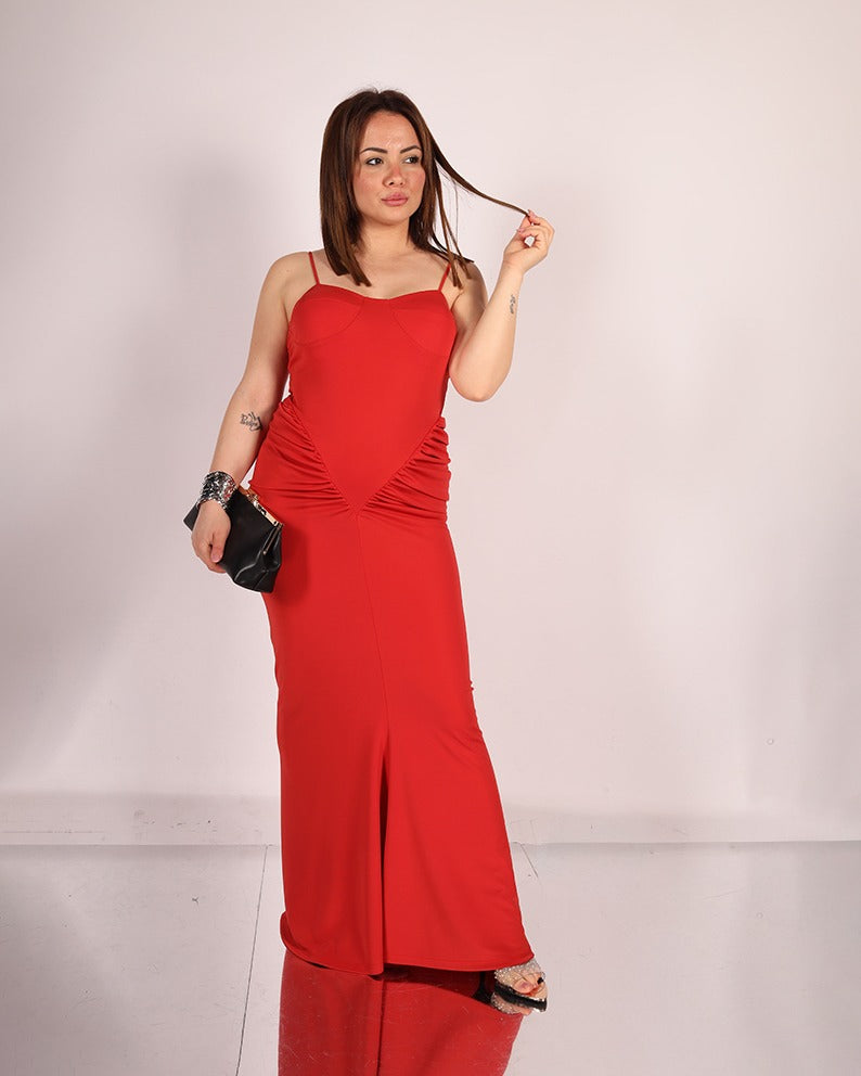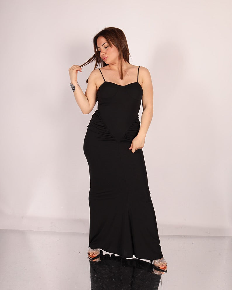 Un capo deciso e super femminile, pensato per chi ama distinguersi. Questo abito lungo unisce sensualità ed eleganza grazie al corpetto strutturato effetto bustier, che valorizza il décolleté e definisce la silhouette.
