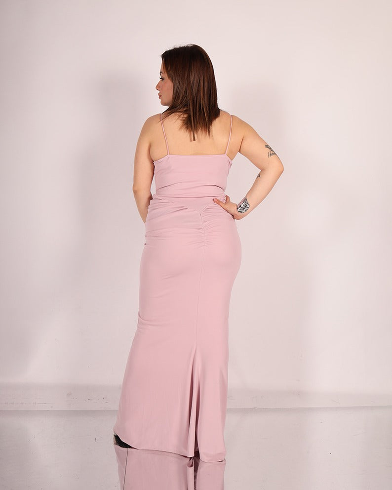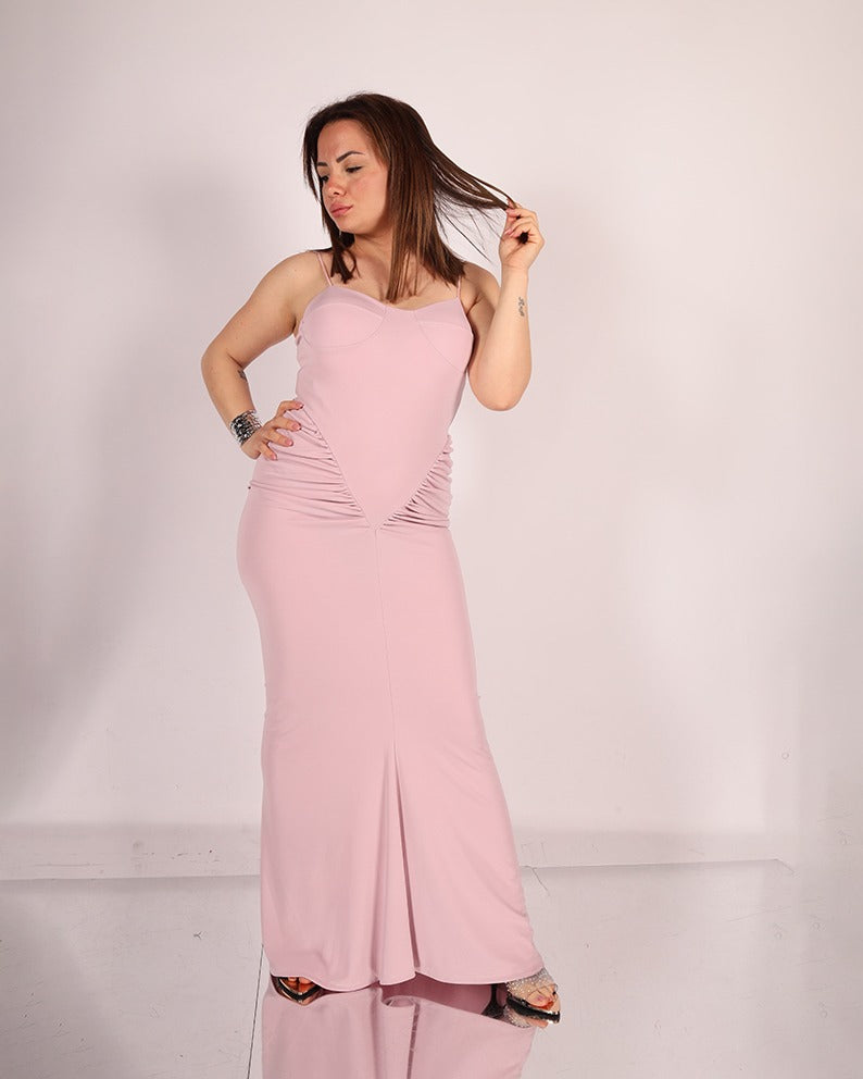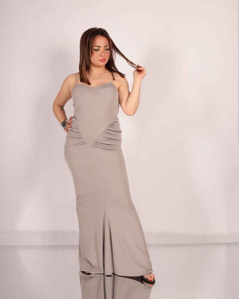 Il design è caratterizzato da un raffinato drappeggio frontale che crea movimento e dona un effetto scultoreo unico. La gonna lunga scende morbida accompagnando ogni passo con fluidità, mentre le spalline sottili aggiungono un tocco delicato e moderno.