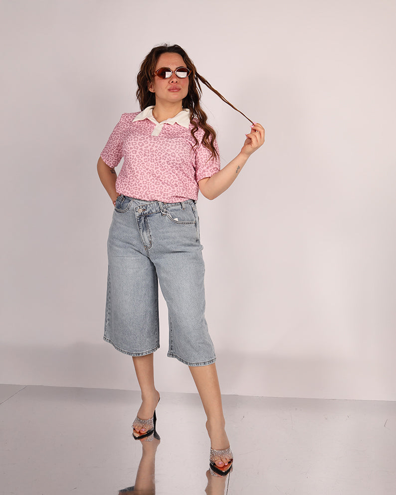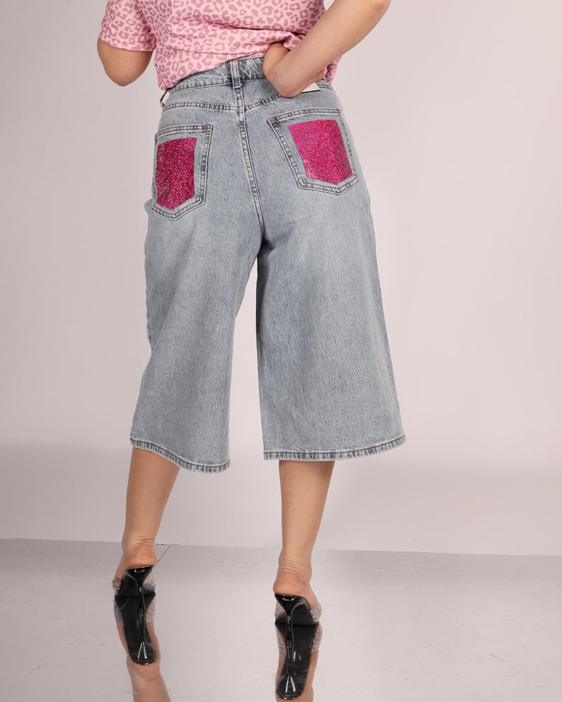 Il dettaglio distintivo è la tasca posteriore impreziosita da applicazioni luminose che donano un tocco brillante e glamour, rendendo il bermuda unico e di tendenza. La vestibilità comoda e il taglio versatile lo rendono ideale per essere abbinato a t-shirt, top o camicie leggere per creare outfit estivi freschi e alla moda.
