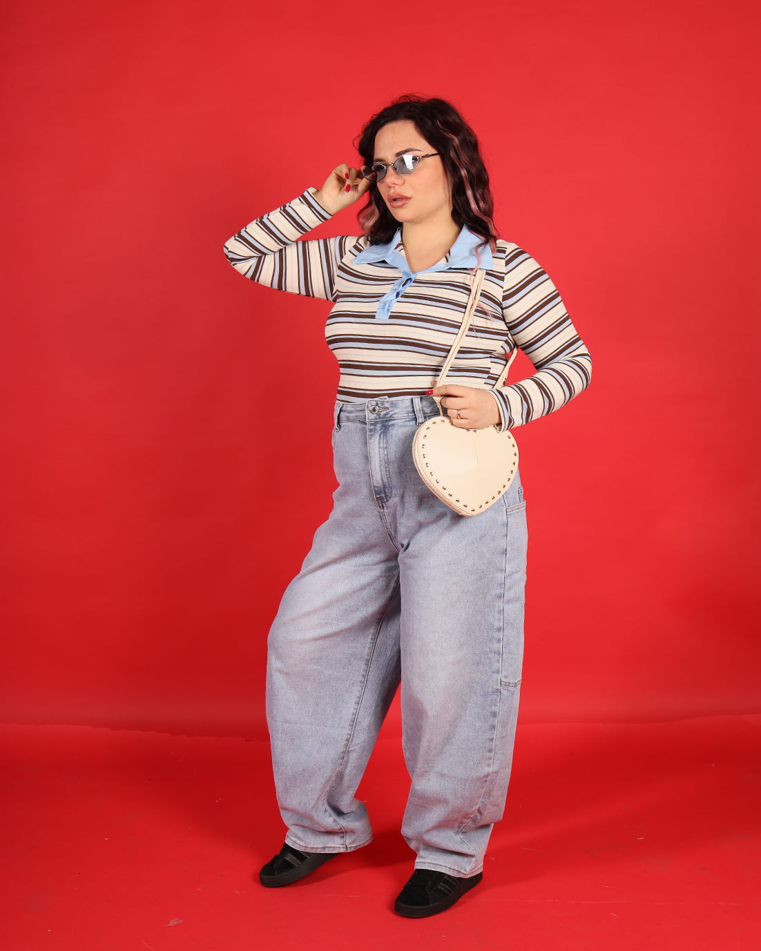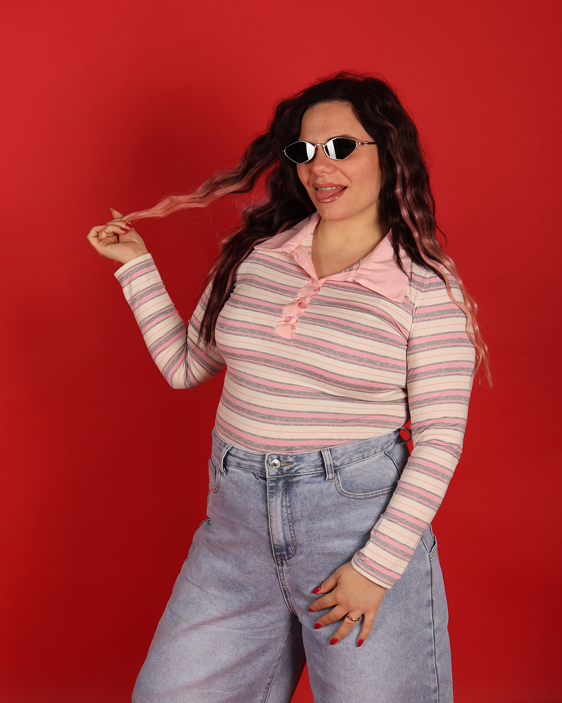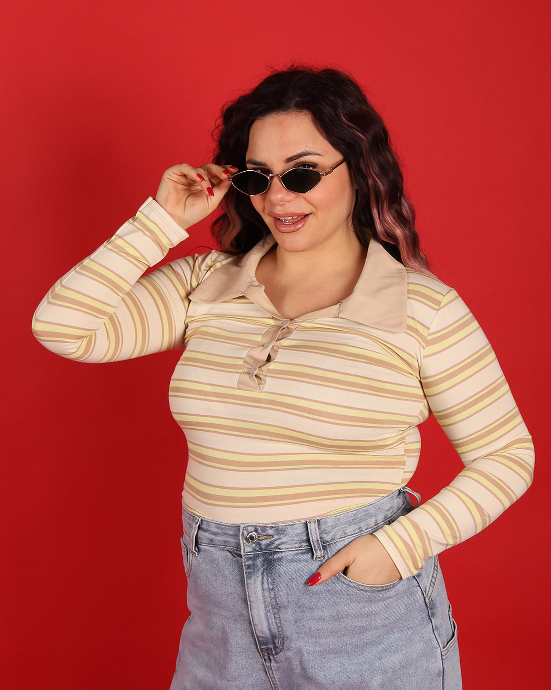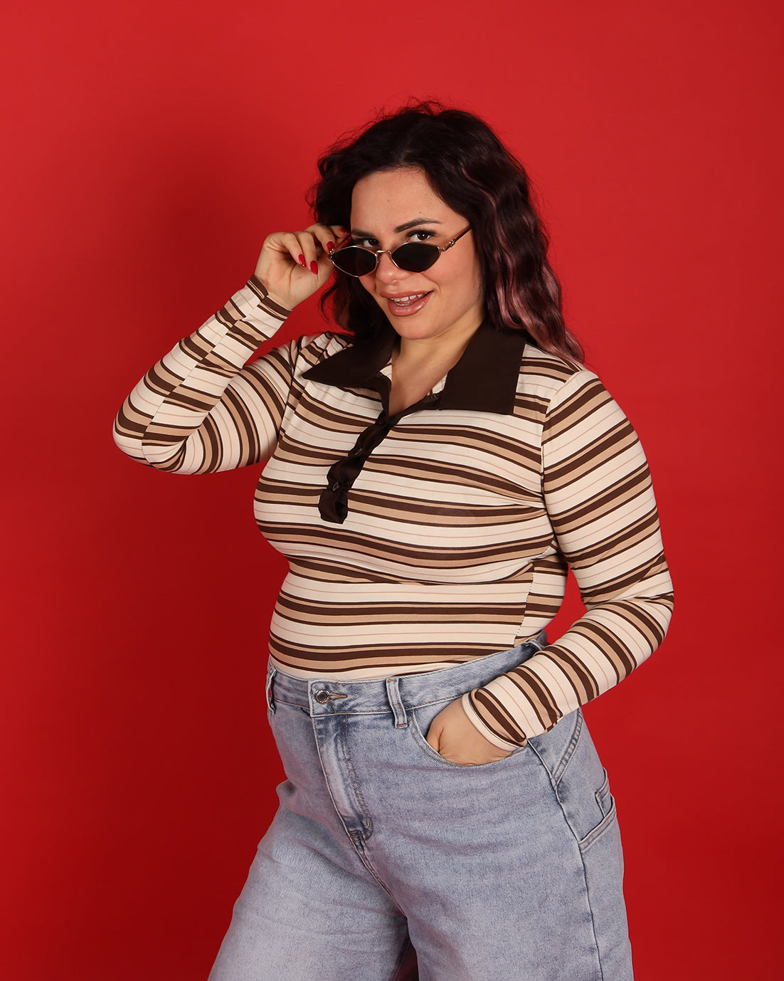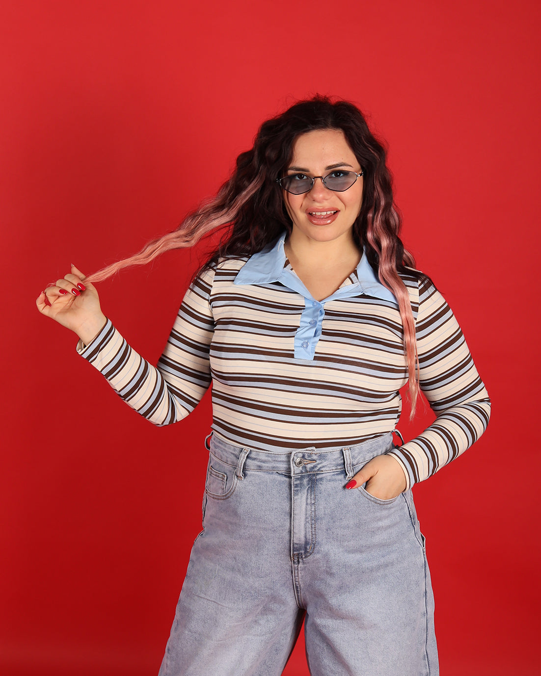 La fantasia a righe orizzontali dona carattere al capo, mentre il colletto a contrasto con apertura a bottoni aggiunge un tocco chic e ricercato. Ideale da indossare sotto blazer, cardigan o da solo per un look curato e di tendenza.
