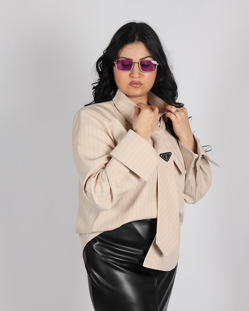 Il design è arricchito da un cravattino coordinato con dettaglio gioiello che aggiunge un tocco chic e sofisticato. Il colletto classico e le maniche lunghe con polsino completano il modello, rendendolo versatile e adatto a diverse occasioni.
