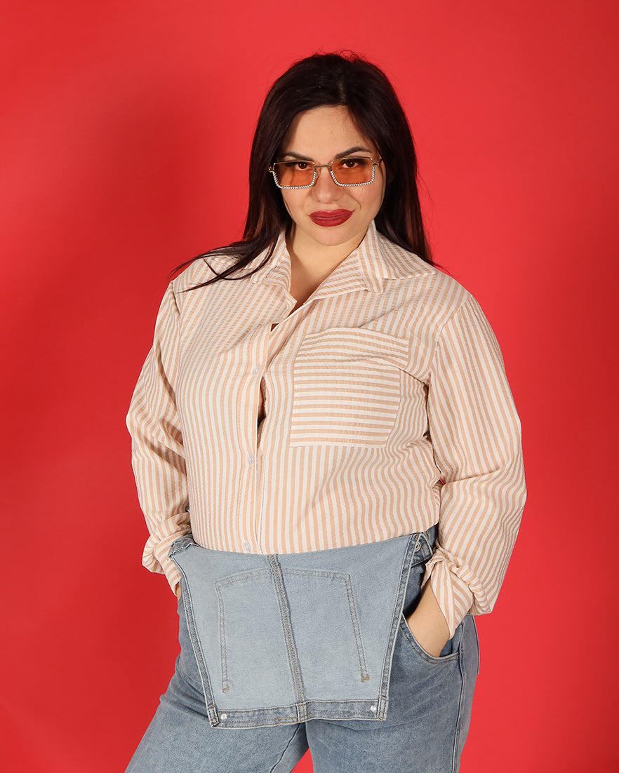 Essenziale ma ricercata, questa camicia è realizzata in tessuto leggero e traspirante, ideale per accompagnarti con stile durante tutta la giornata. La fantasia a righe verticali slancia la figura, mentre la tasca frontale a righe orizzontali crea un raffinato gioco di contrasti che rende il capo unico.