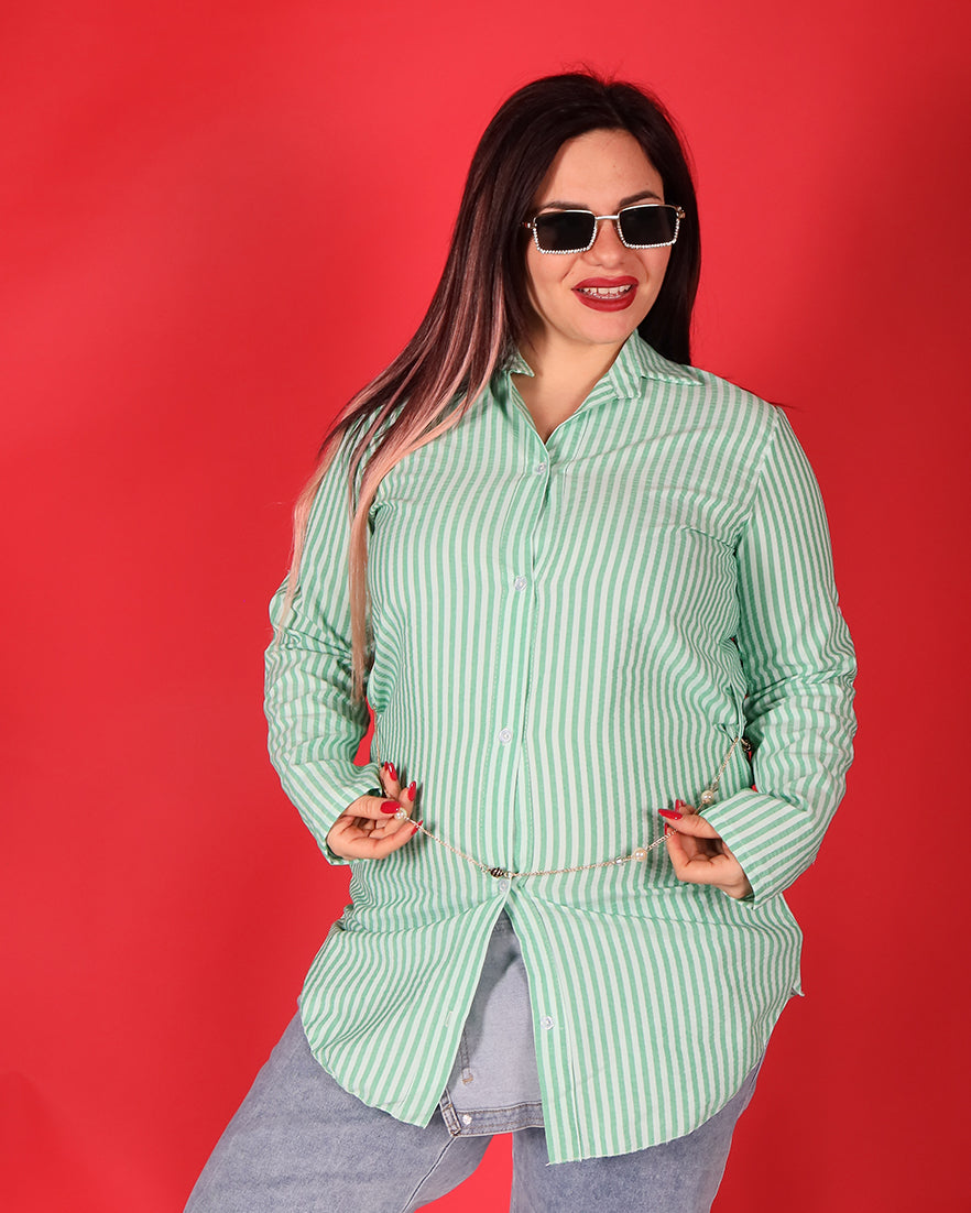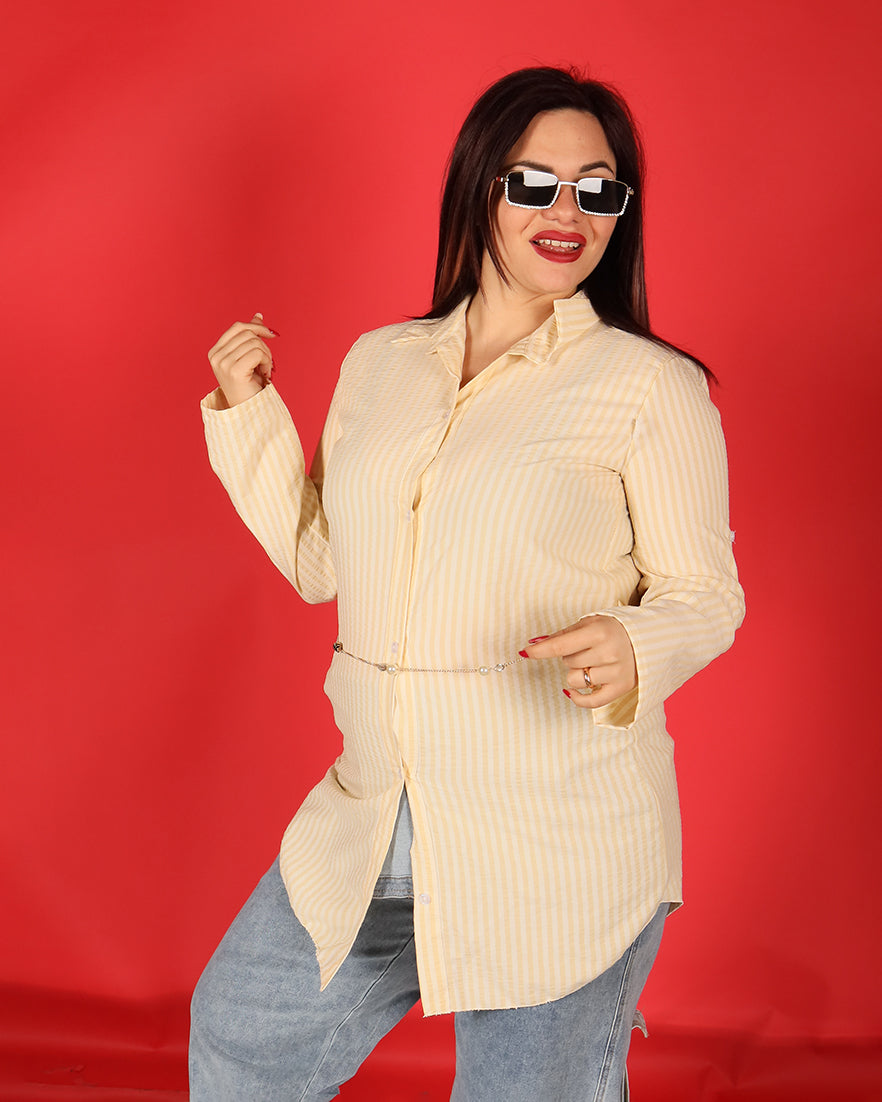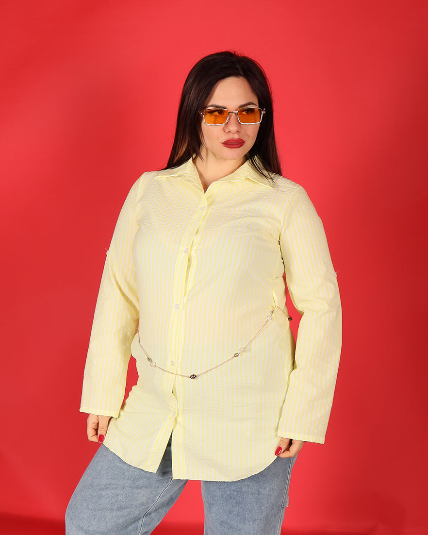Fresca, femminile e ricercata, questa camicia è realizzata in tessuto leggero con lavorazione goffrata, che dona movimento e carattere al capo. Il colore luminoso illumina il look, mentre i delicati dettagli gioiello con catenina e perle aggiungono un tocco elegante e raffinato.