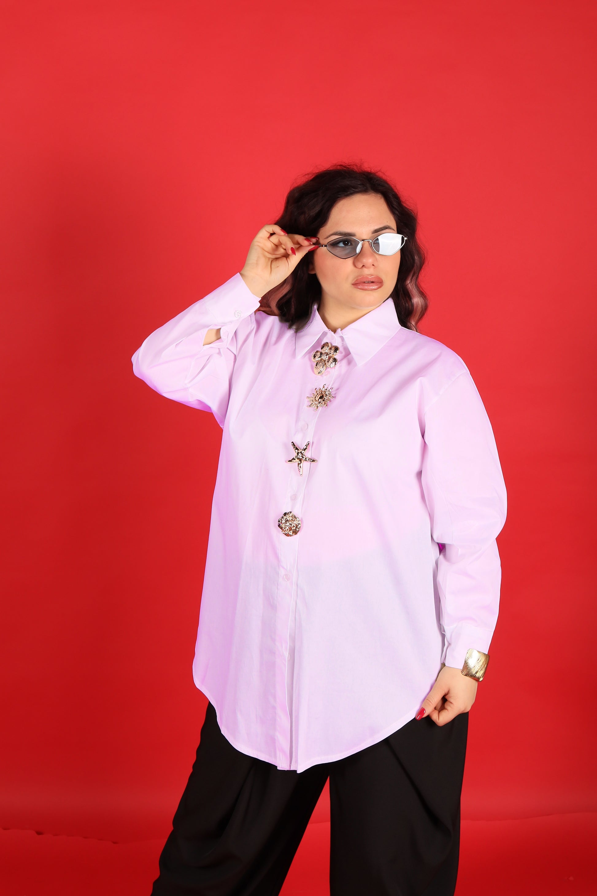 Il vero protagonista è il dettaglio dei bottoni gioiello, luminosi e ricercati, che aggiungono eleganza e personalità al capo. Perfetta da indossare sia con pantaloni sartoriali che con jeans, per look da giorno o da sera.