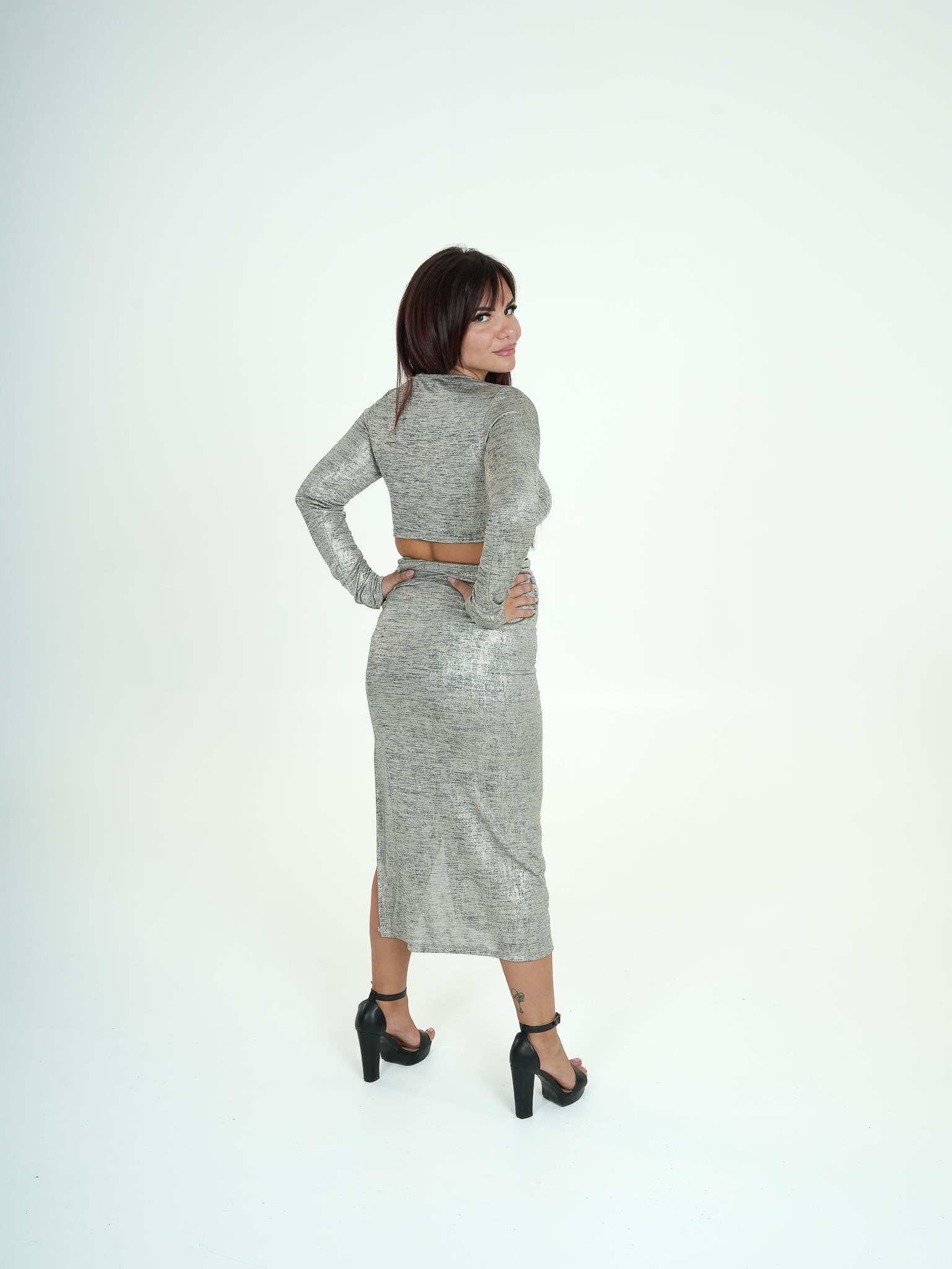 Maglietta coordinata a maniche lunghe e gonna lunga con spacco molto elastica. Taglia Unica calza dalla 40 alla 48