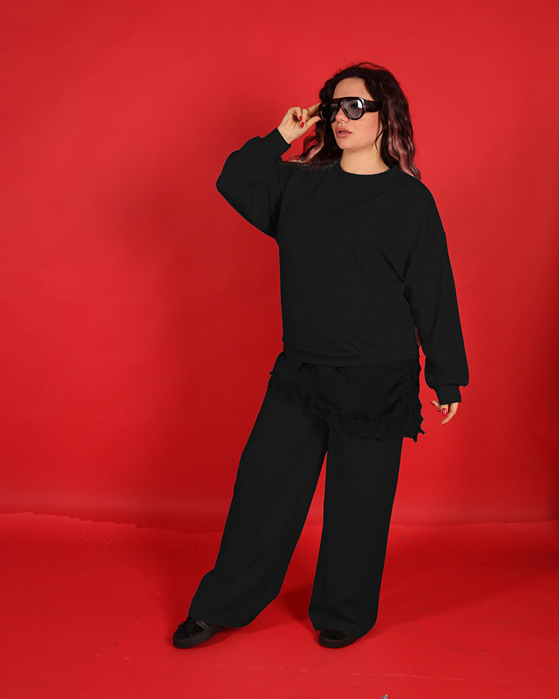 La felpa girocollo presenta una vestibilità comoda e moderna, impreziosita da inserti in pizzo nella parte inferiore che aggiungono leggerezza e romanticismo al design. Le maniche leggermente arricciate donano movimento e un’allure elegante anche a un capo casual.
