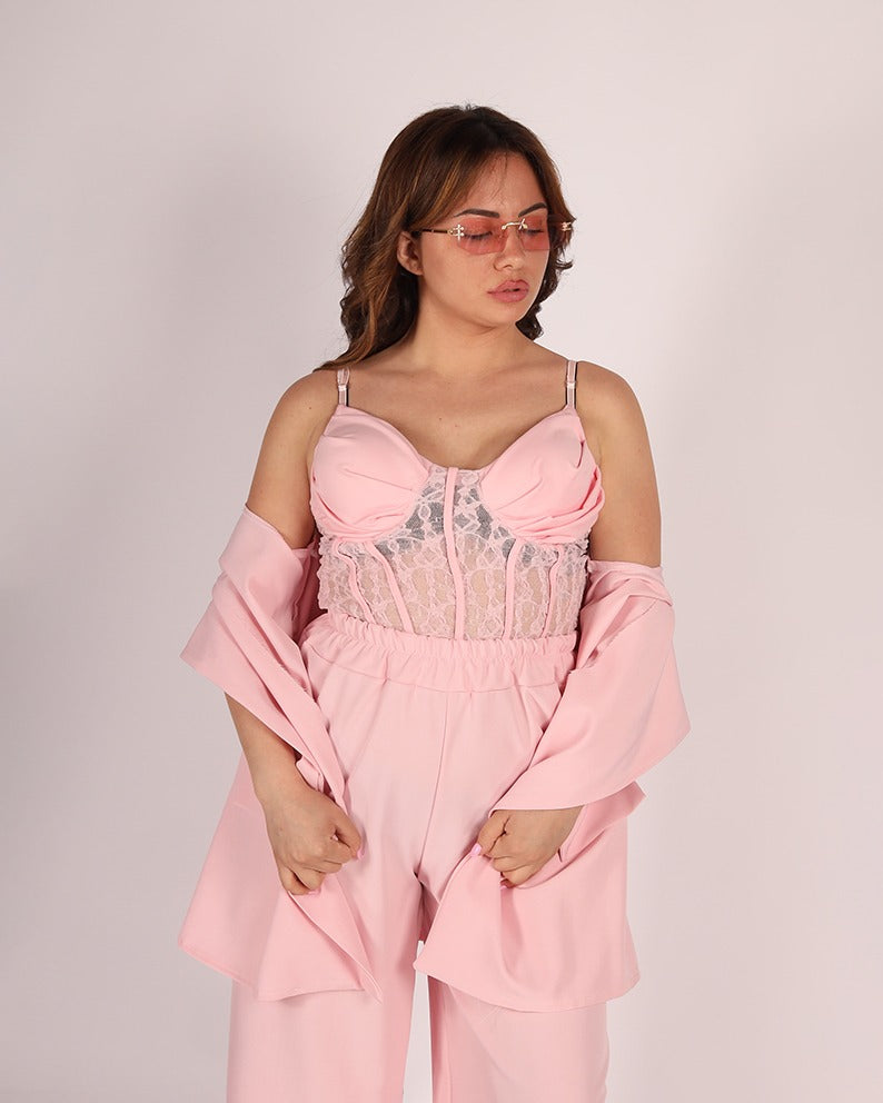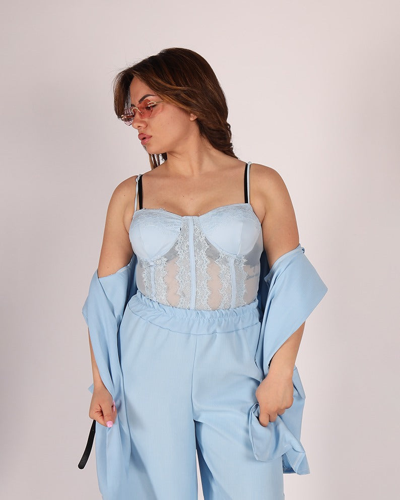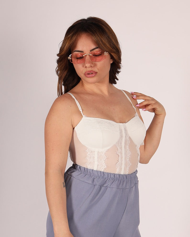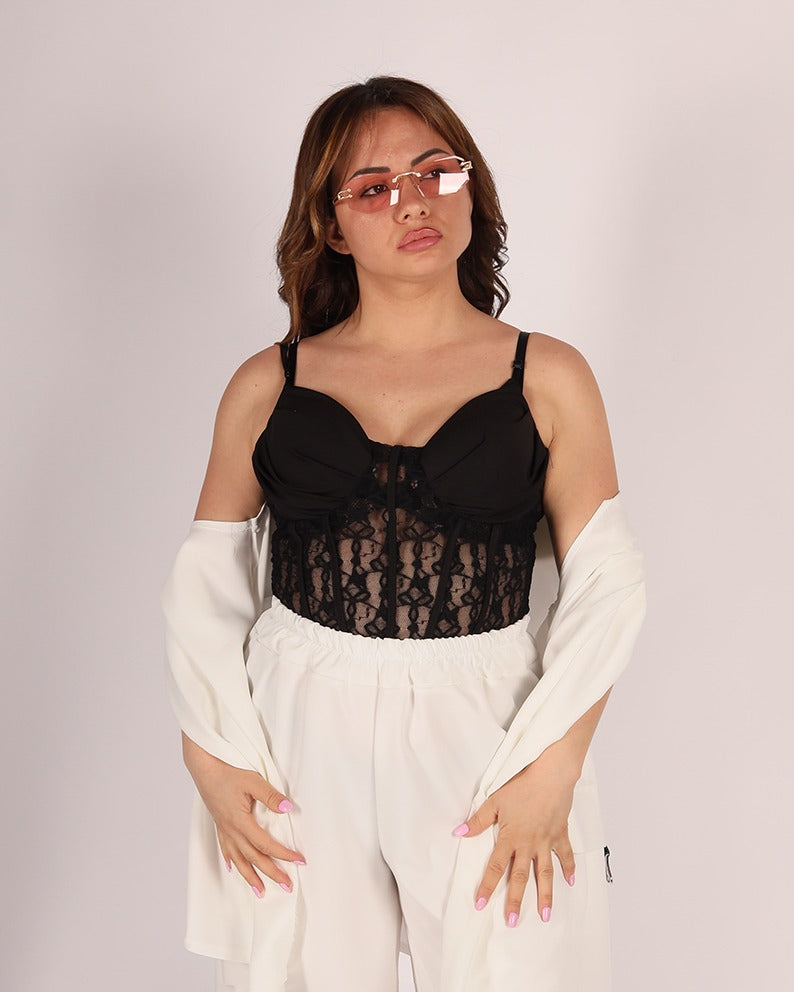 Un corpetto femminile e seducente, perfetto per valorizzare la silhouette con eleganza. Il design strutturato con coppe modellate e spalline sottili offre sostegno e comfort, mentre il tessuto in pizzo lavorato dona un tocco romantico e raffinato.
