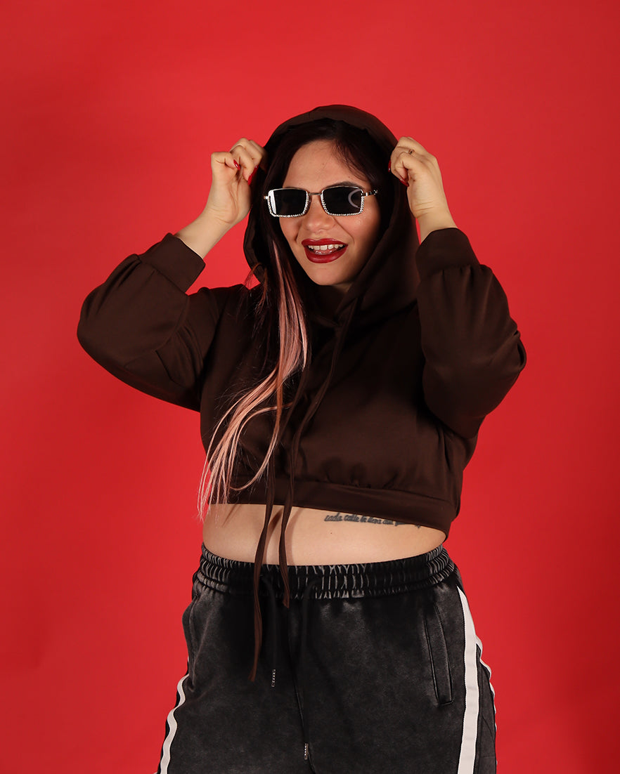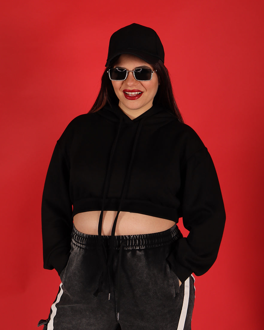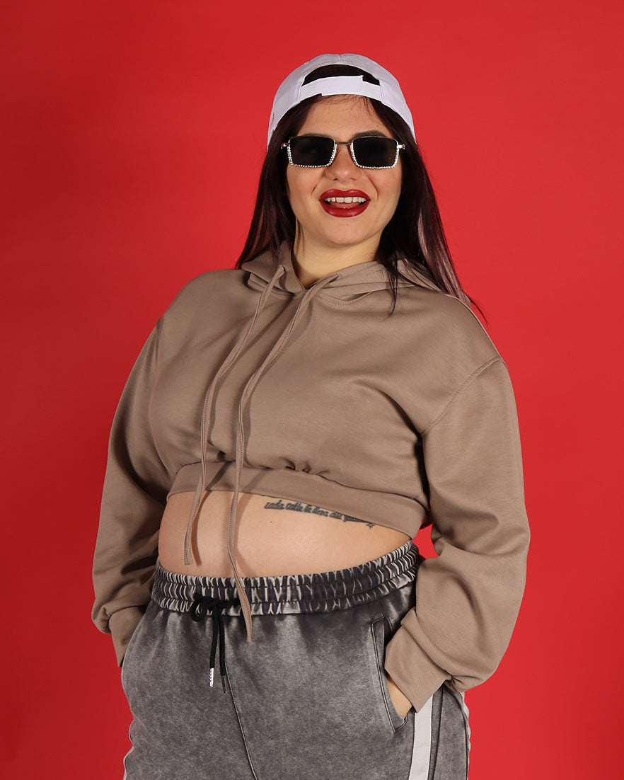 Casual ma super trendy, questa felpa cropped è il capo perfetto per completare i tuoi look sporty-chic. Il taglio corto valorizza il punto vita, mentre il cappuccio con laccetti aggiunge un tocco urban e contemporaneo.