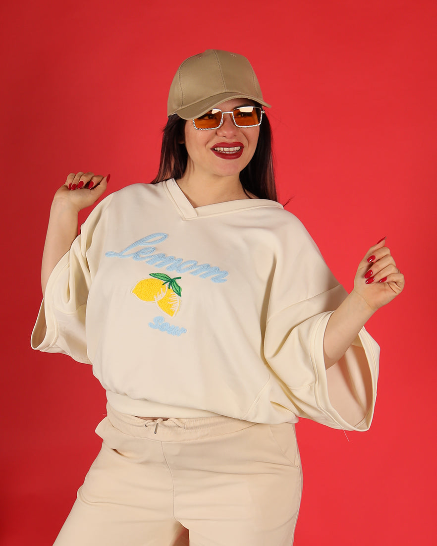 Fresca, allegra e super trendy: questa felpa è il capo ideale per dare un tocco solare ai tuoi look quotidiani. Realizzata in tessuto morbido e confortevole, si distingue per il ricamo Lemon con limoni sul davanti, un dettaglio vivace che richiama subito vibes estive e spensierate.