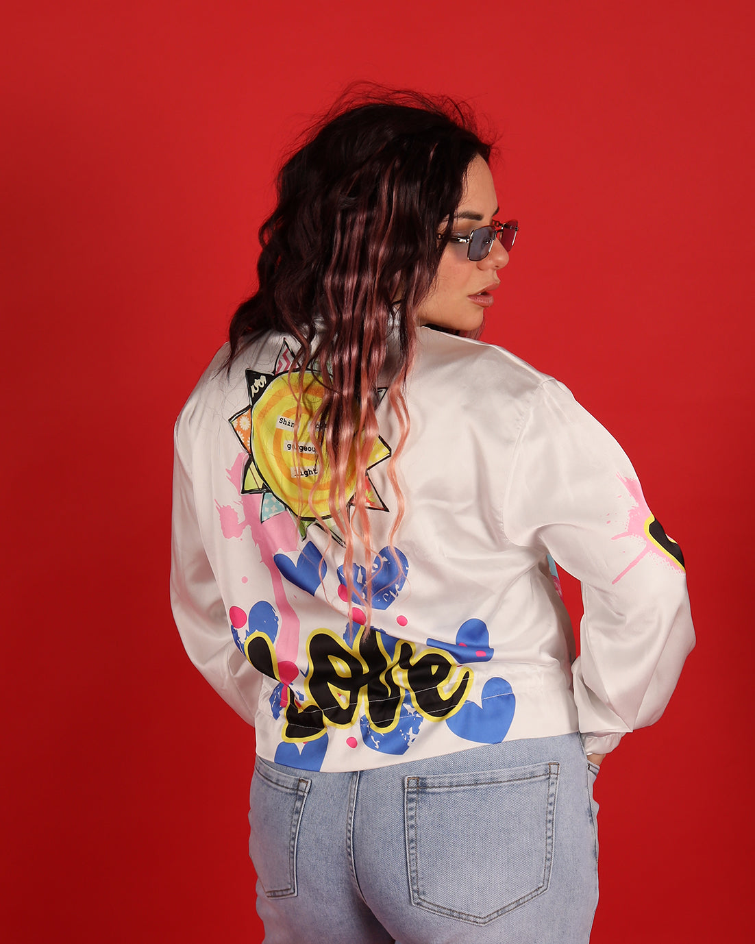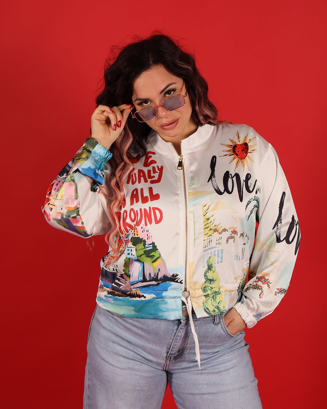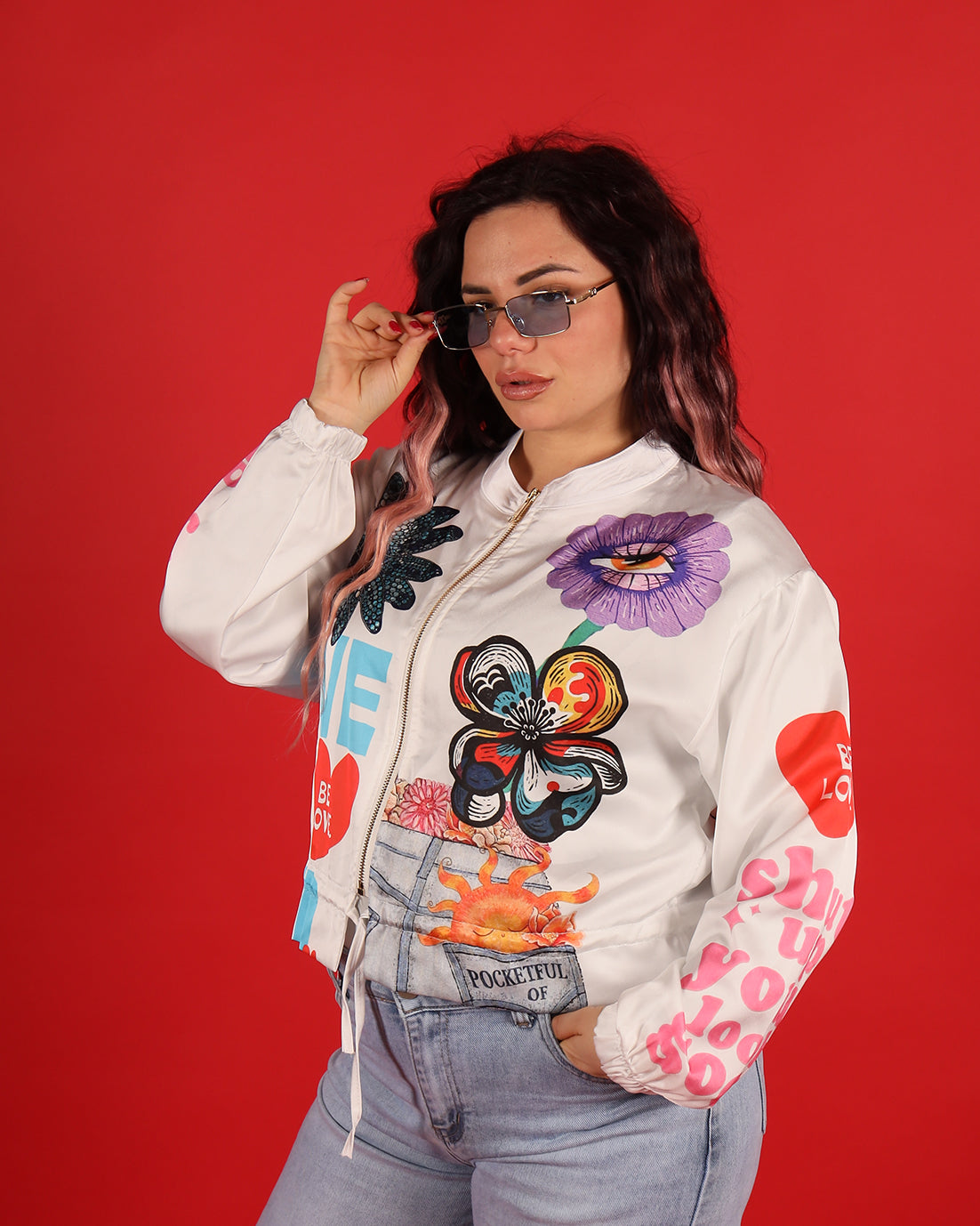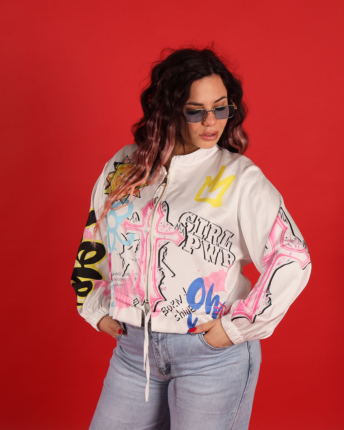 Un giubbino dallo stile audace e contemporaneo, perfetto per chi ama farsi notare. Questo giubbino leggero è caratterizzato da stampe grafiche multicolor in stile street art che donano energia, personalità e un mood super fashion al look.