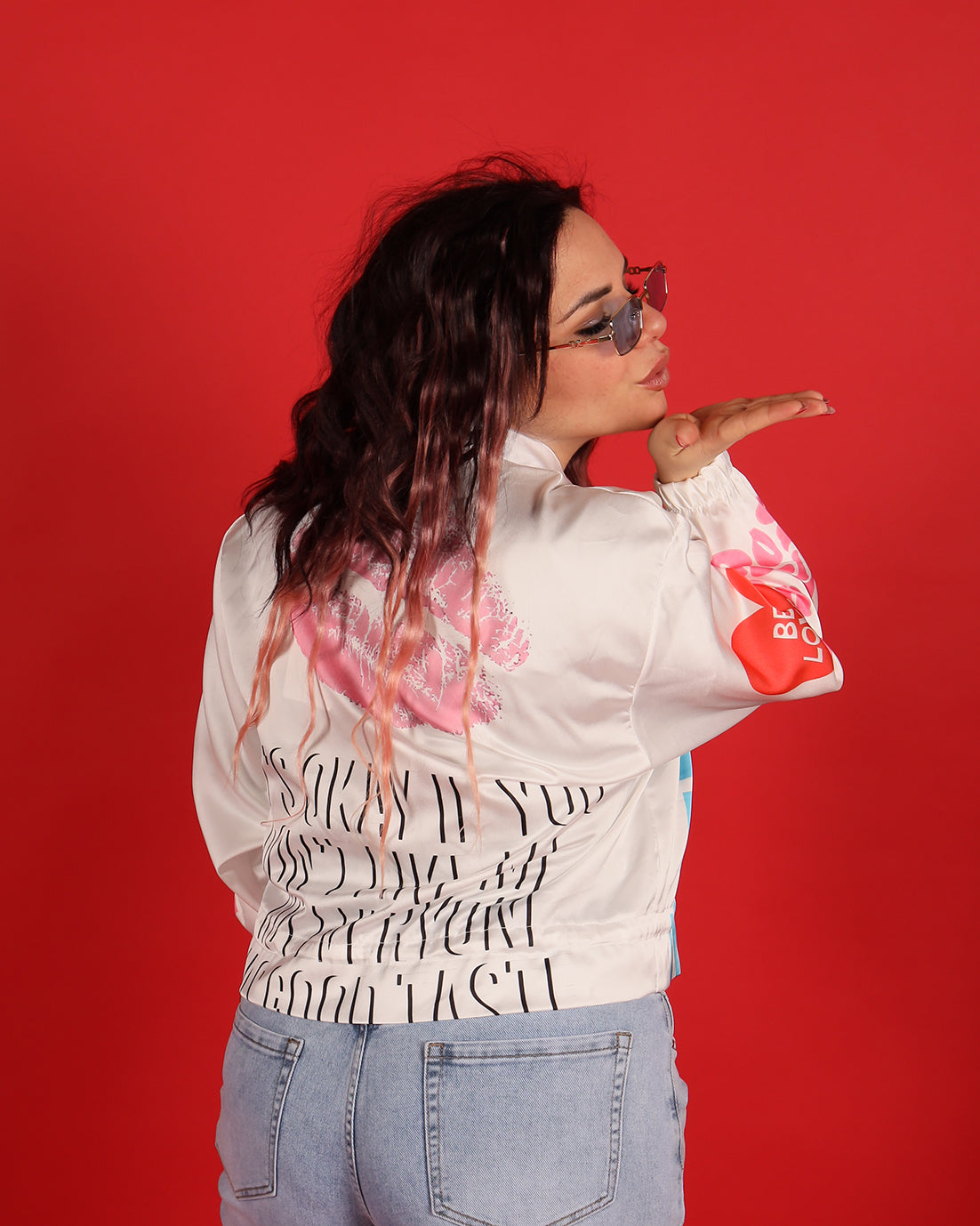 La chiusura frontale con zip lo rende pratico e versatile, mentre l’elastico sul fondo e sui polsini assicura una vestibilità comoda e femminile. Il tessuto leggero lo rende ideale per la mezza stagione, perfetto da abbinare a jeans, jogger o coordinati per un outfit urban-chic.