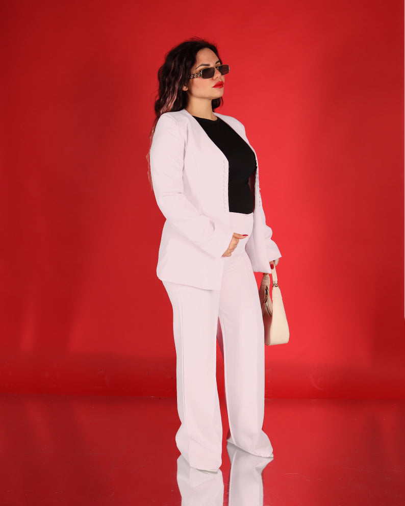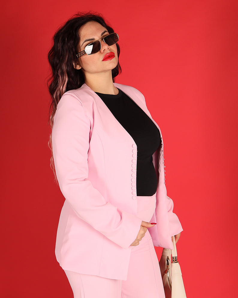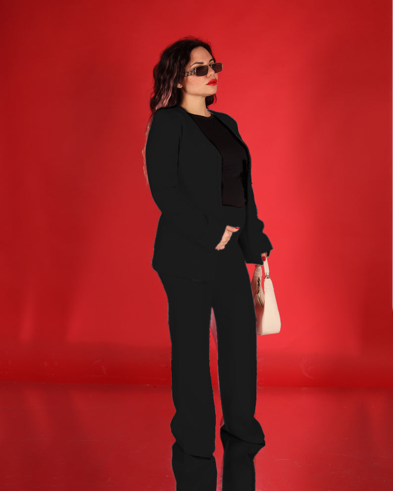La giacca presenta una linea pulita con chiusura frontale a bottoncini rivestiti, dettaglio chic che valorizza il design e dona un tocco sartoriale. Il pantalone ha una vestibilità dritta e fluida, che slancia la figura e garantisce comfort durante tutta la giornata.