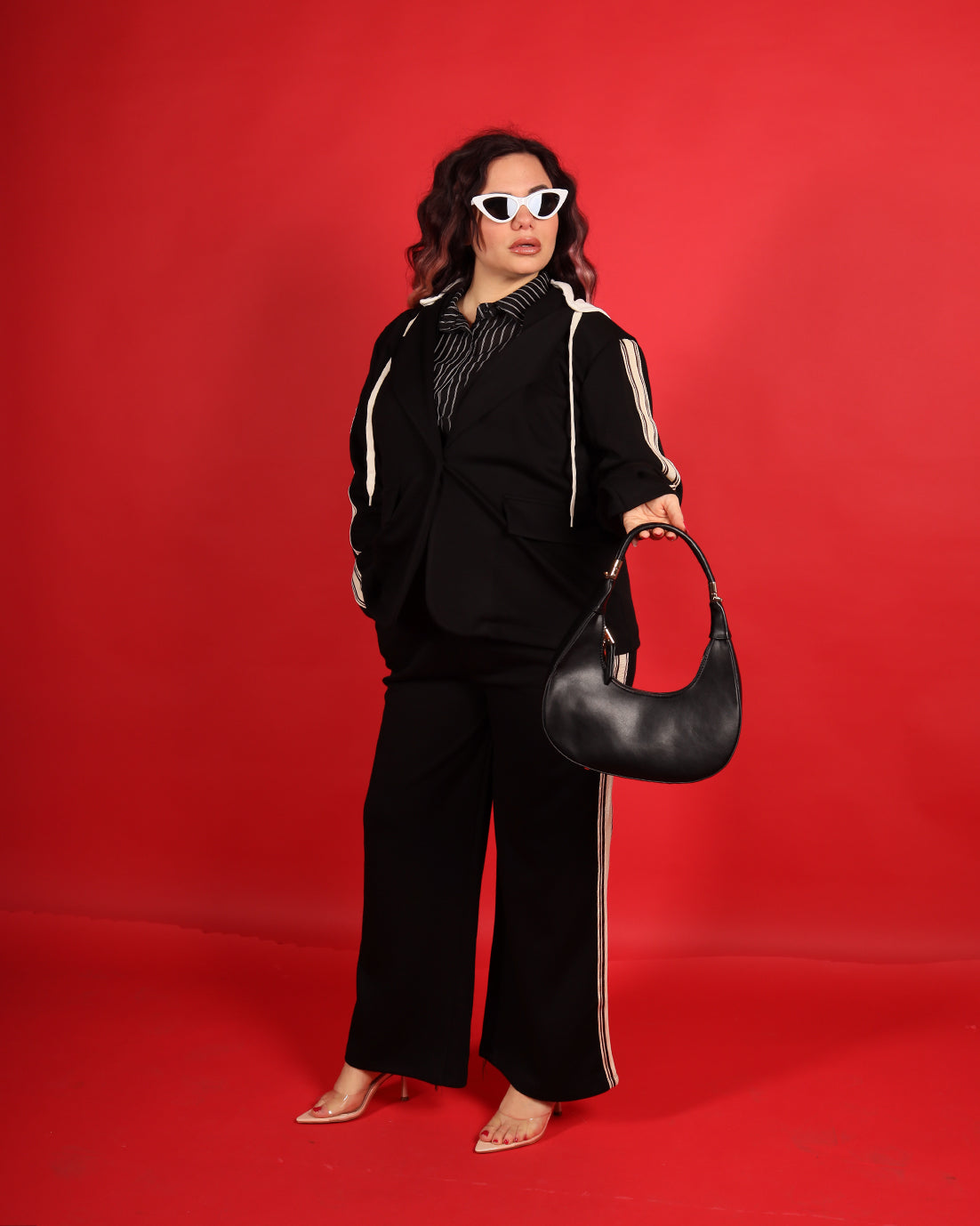 La giacca monopetto presenta un elegante rever classico abbinato al cappuccio bianco a contrasto con coulisse, dettaglio che dona carattere e unicità al capo. Il pantalone, comodo e fluido, completa il look con una vestibilità pratica e femminile.