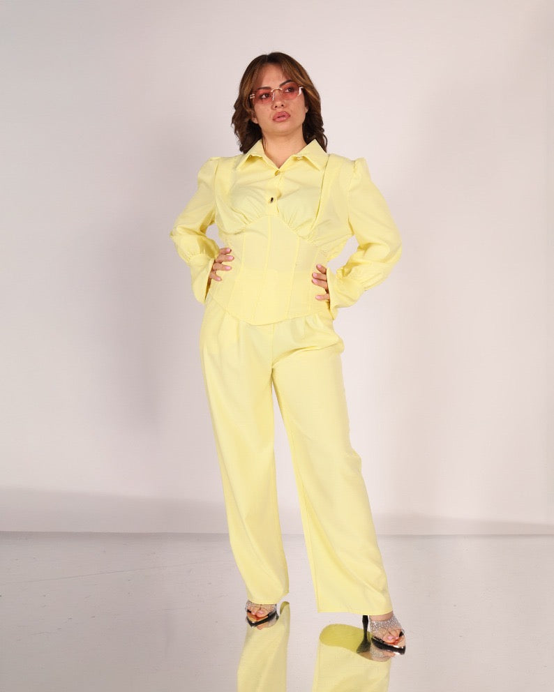Raffinato e femminile, questo tailleur è la scelta ideale per chi desidera un look elegante ma moderno. Realizzato in tessuto fluido e leggero, si distingue per il suo delicato colore giallo pastello che dona luminosità e freschezza all’outfit.