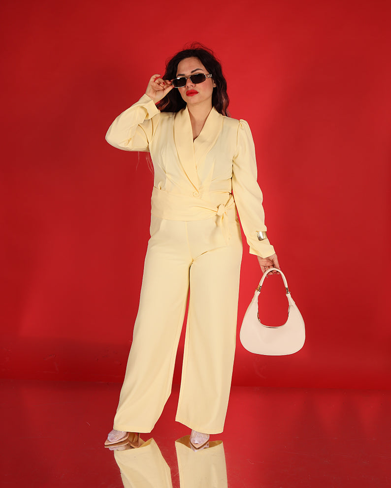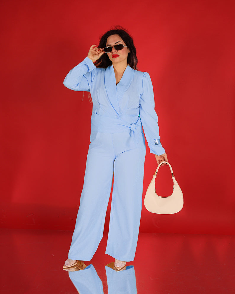 Il modello presenta un rever morbido stile giacca e una cintura coordinata in vita che valorizza le forme, mentre il pantalone a gamba ampia slancia la figura e dona movimento. Perfetta per cerimonie, eventi speciali o occasioni eleganti, ma facilmente adattabile anche a look più casual con gli accessori giusti.