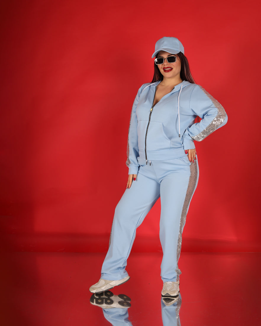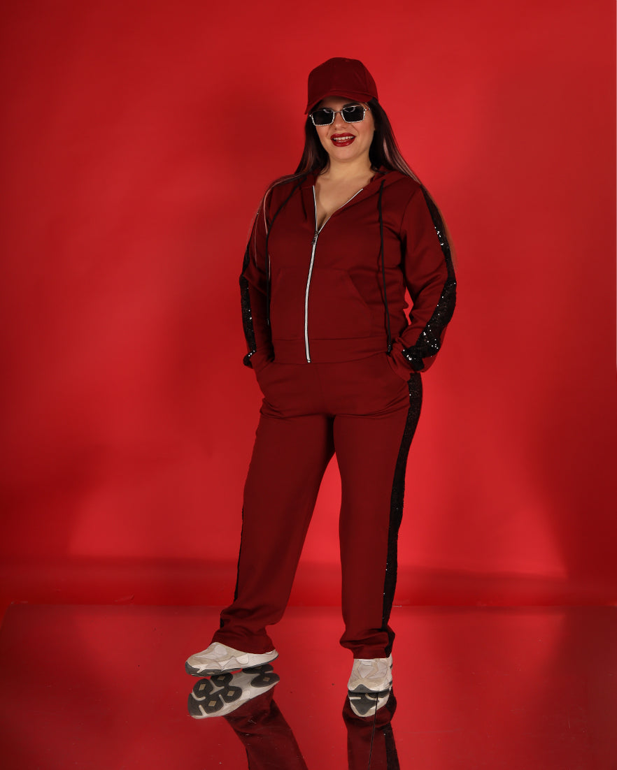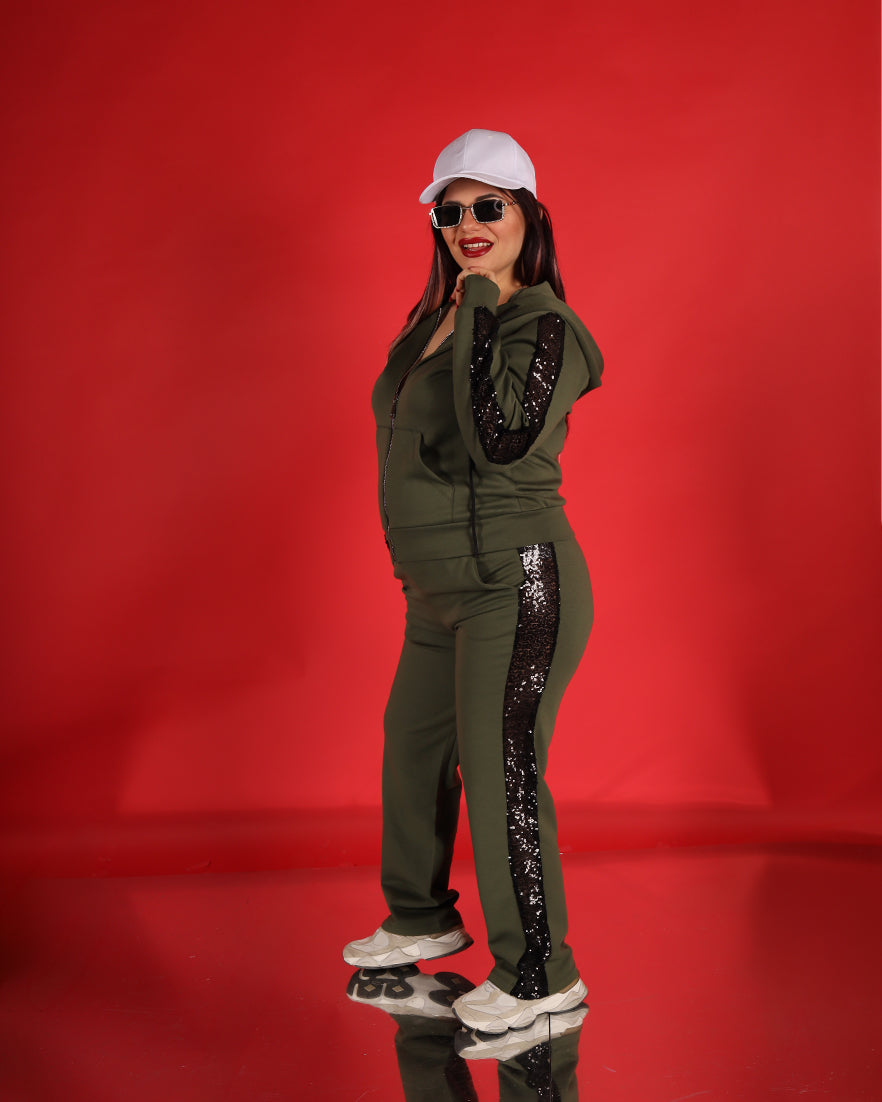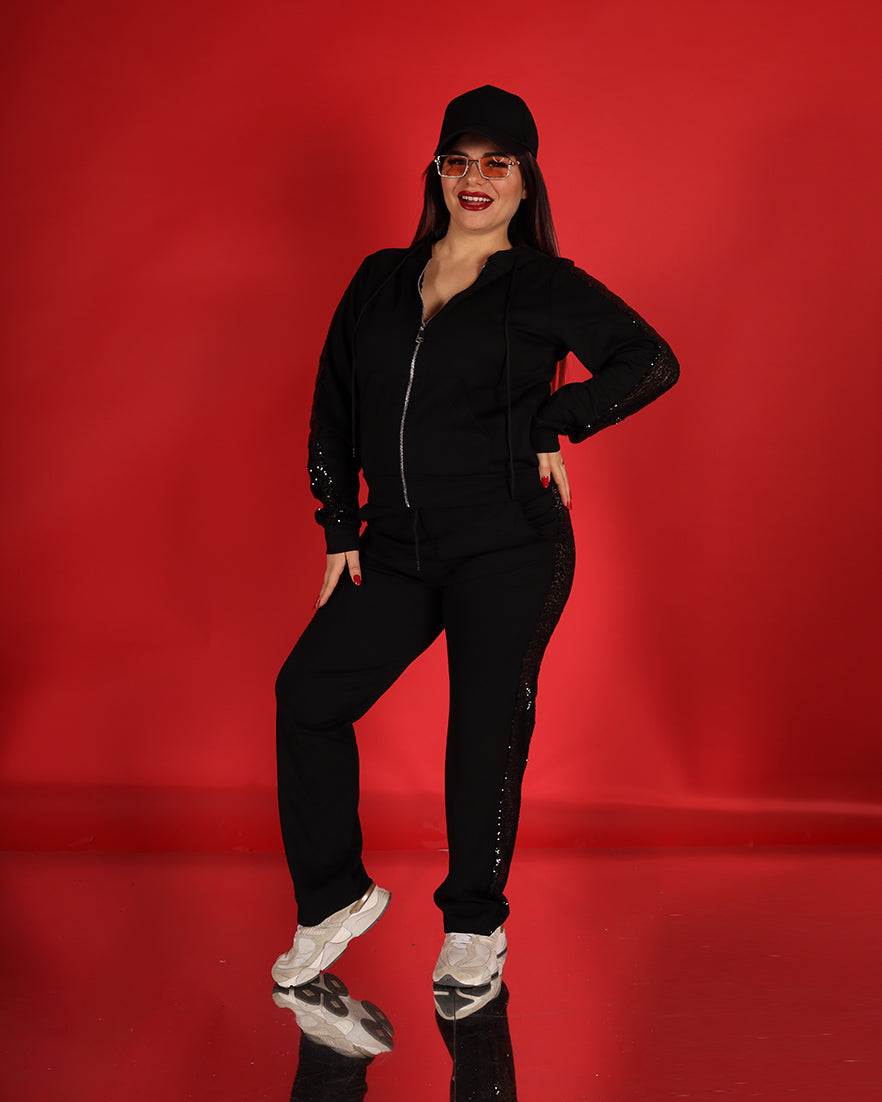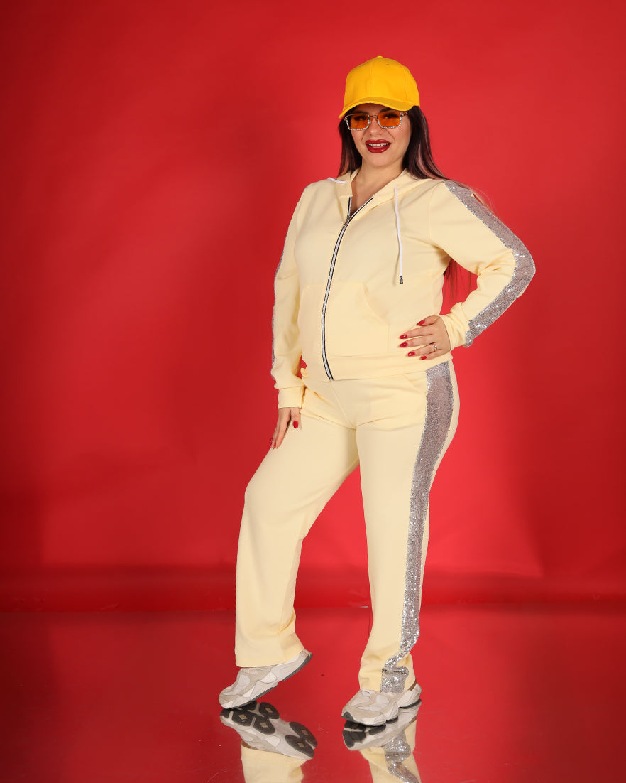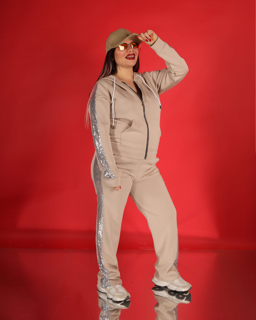 Un capo che unisce comfort e luminosità in modo impeccabile. Questa tuta è realizzata in tessuto morbido e avvolgente, ideale per accompagnarti durante tutta la giornata, senza rinunciare allo stile. Le bande laterali con dettaglio pailletters donano luce e slanciano la silhouette, rendendo il look femminile e raffinato.