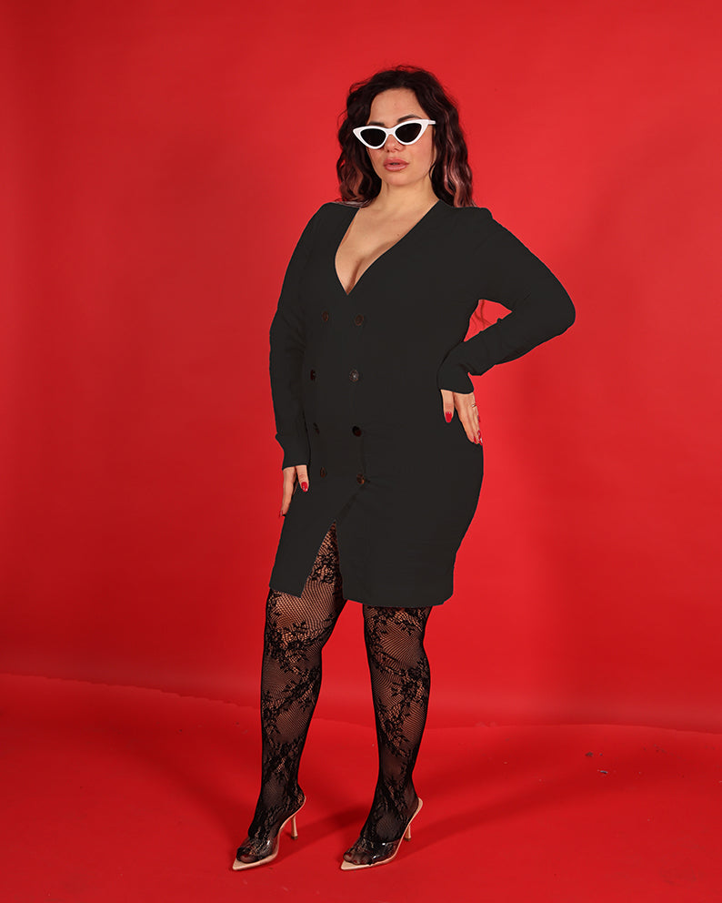 Lo scollo a V con rever slancia la figura, mentre la chiusura doppiopetto con bottoni dorati aggiunge un tocco luminoso e ricercato. La vestibilità è strutturata ma confortevole, ideale sia per occasioni speciali che per look eleganti da giorno o da sera.