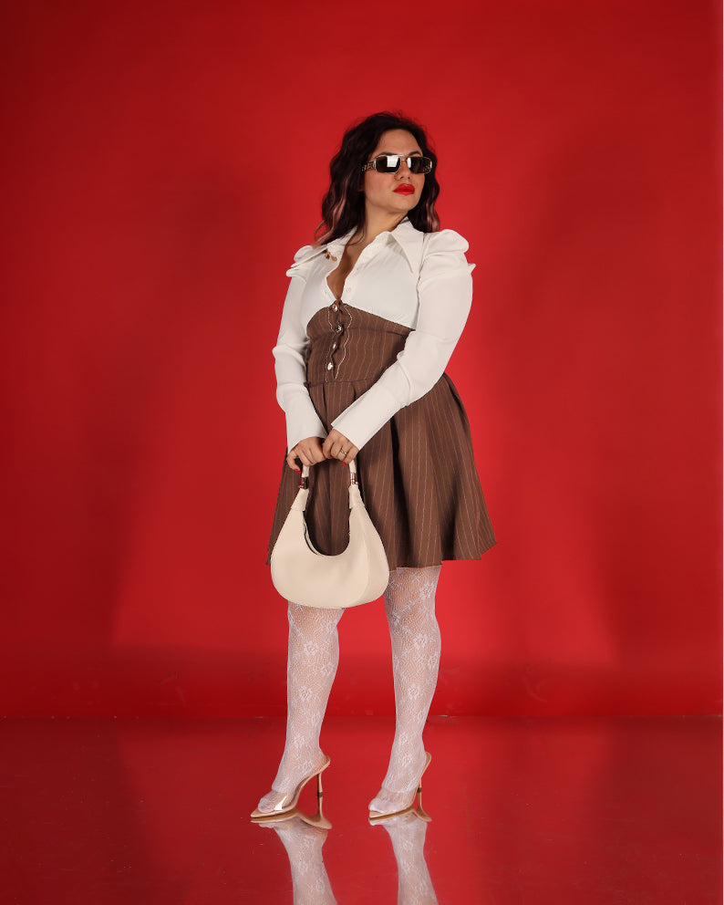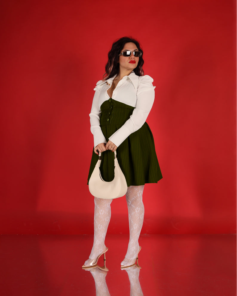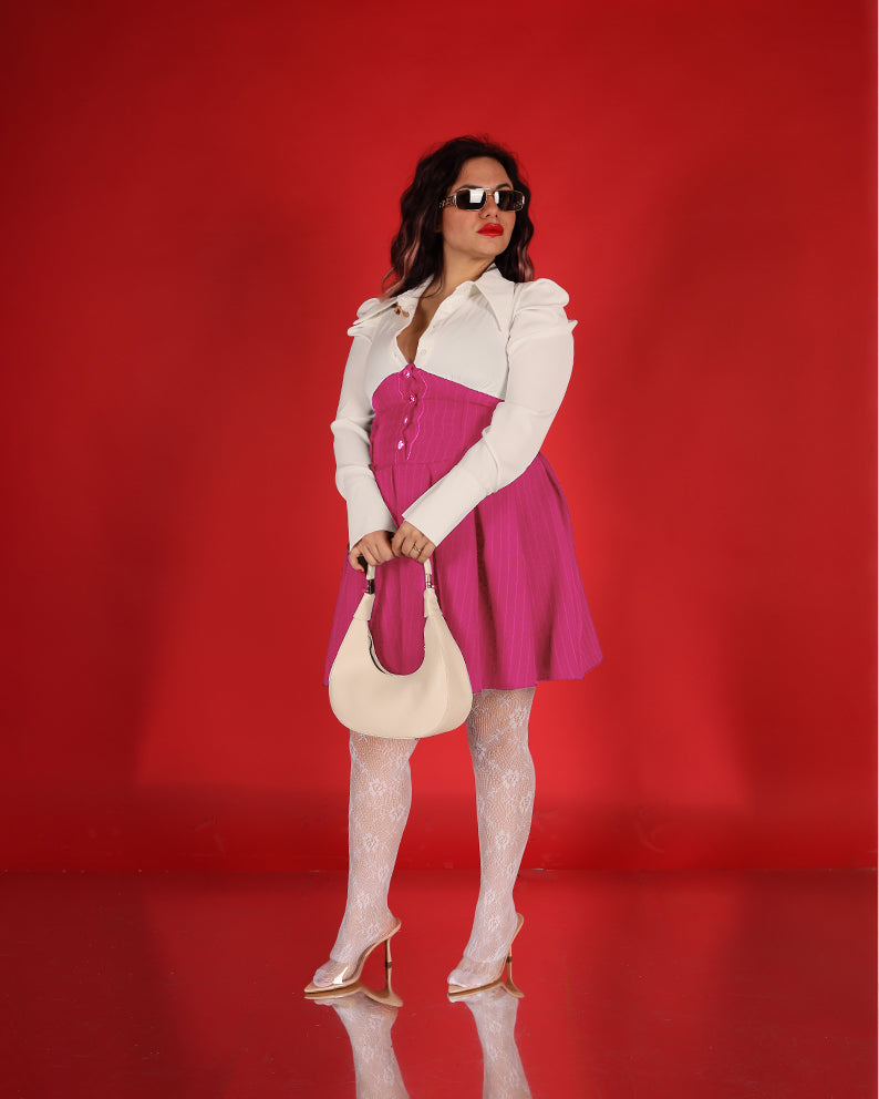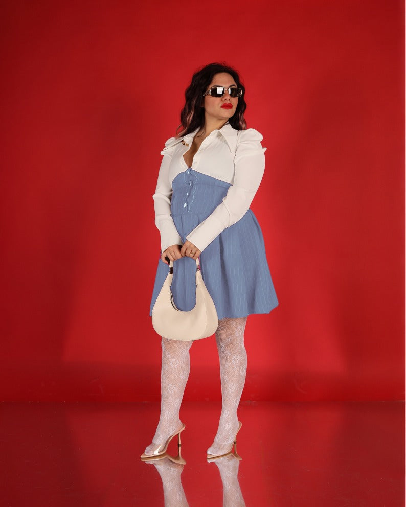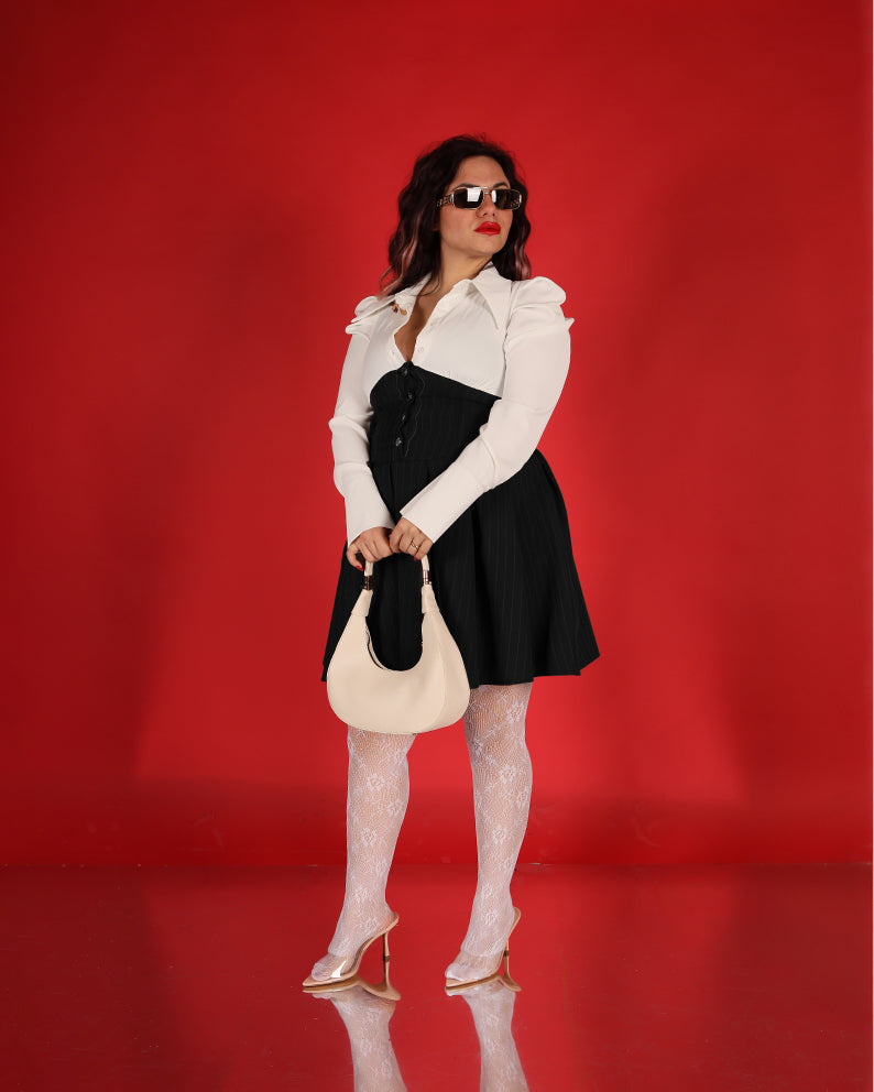 Un capo delicato e sofisticato, questo vestitino bicolor unisce eleganza classica e dettagli moderni.